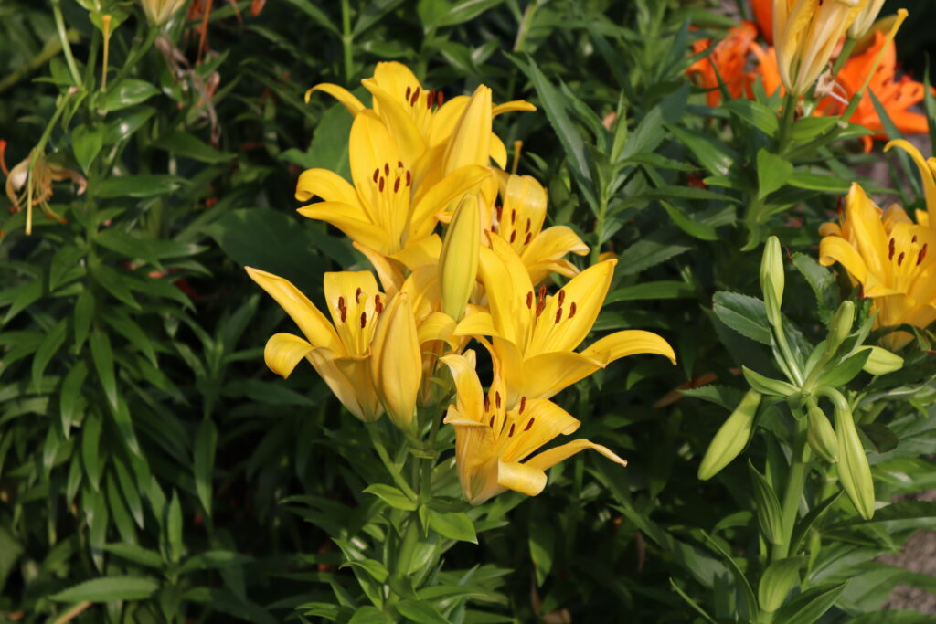 百合の花も見つけました。イエローダイアモンドとも呼ぶそうです。ユリ(百合)の花言葉は「純潔」「無垢」「威厳」などです。ユリの花が放つ清潔感や高貴な印象にぴったりで、ピュアな心を持った女性や尊敬する大切な人へのプレゼントに適しています。また、6月の誕生花でもあることから誕生日プレゼントとしてもおすすめです。