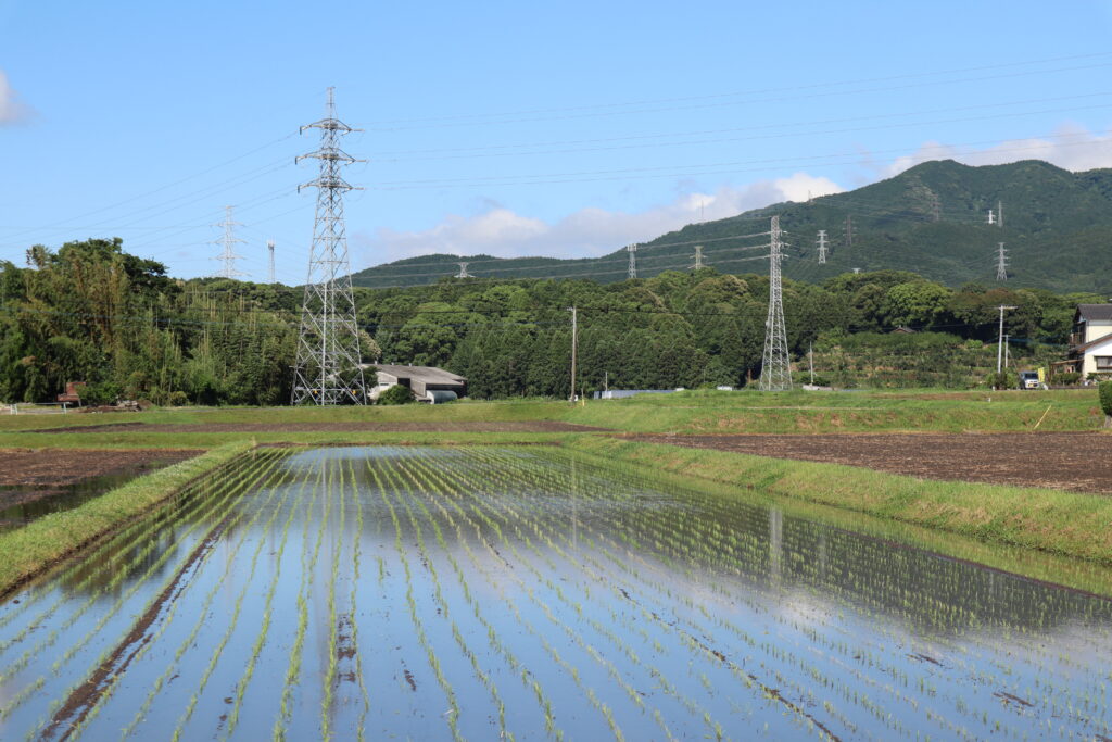 ついに6月17日(昨日)九州北部は梅雨入りしました。麦畑の刈取り、耕運機での作業、水路から水を引き込む作業。色々ありますね。そしてここ数日で稲の田植えをする田んぼが増えました。機械で植えられるところは植えて、細かい角の部分などは手作業で農家の方が植えられていました。それがまた絵になる風景で、地下足袋を履き、ぬかるみから1歩1歩足を抜き差ししながらの作業。大変ですね。稼いでいくのは何でも楽なものはないですね。アマガエルの鳴き声もけたたましくなってきました。よく観察していると水路の水は山の方から来ているようです。高いところから低いところへ水は流れるので当たり前といえば当たり前なのですが、発見した私は少なからず感動してしまいました。次の写真は田植えされた田んぼです。梅雨が明け本格的な夏が来て、秋になれば稲の刈取りの作業です。季節の移ろいを感じさせますね。農家の方は長雨、台風など自然が相手なので季節の移ろいに自然と敏感になるのでしょうね。太宰治の作品の中で夏の風景の中に秋を感じるという一節があったのを思い出します。初夏の田植えの風景に秋の刈取りの予感がするのは自然なことでしょうね。ああ私はあと何回この風景を繰り返し見ることができるのかな?人間の命の有限性に思いをはせました。